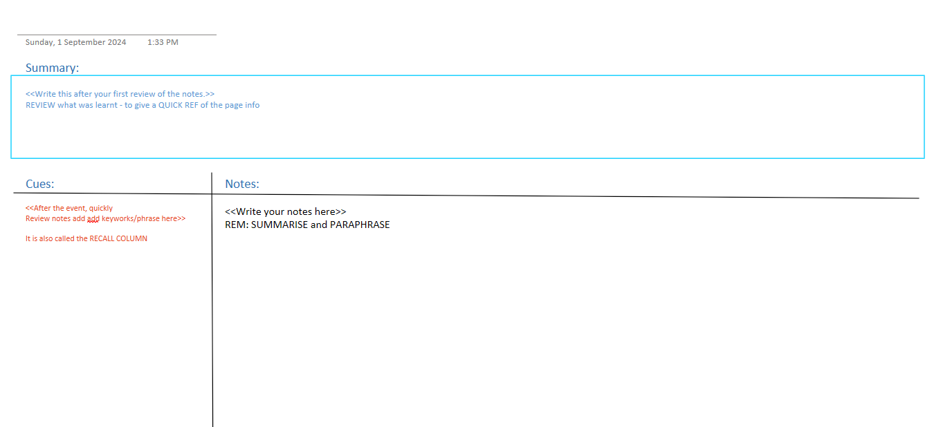 Instead I write my notes in OneNote, and have a template that each unit (or subunit) is on a Cornell Note template page. It has a summary at the top, I often neglect to update (or update only a month after the class). But I do update the Cue collum to the left weekly or so, to summaries the notes and quotes I can copied or summarised out of the course reading. Often I highlight the papers and chapters I read, and then copy in the pdf to the notes so I can open it and review the information when referencing back to my notes for assignments.